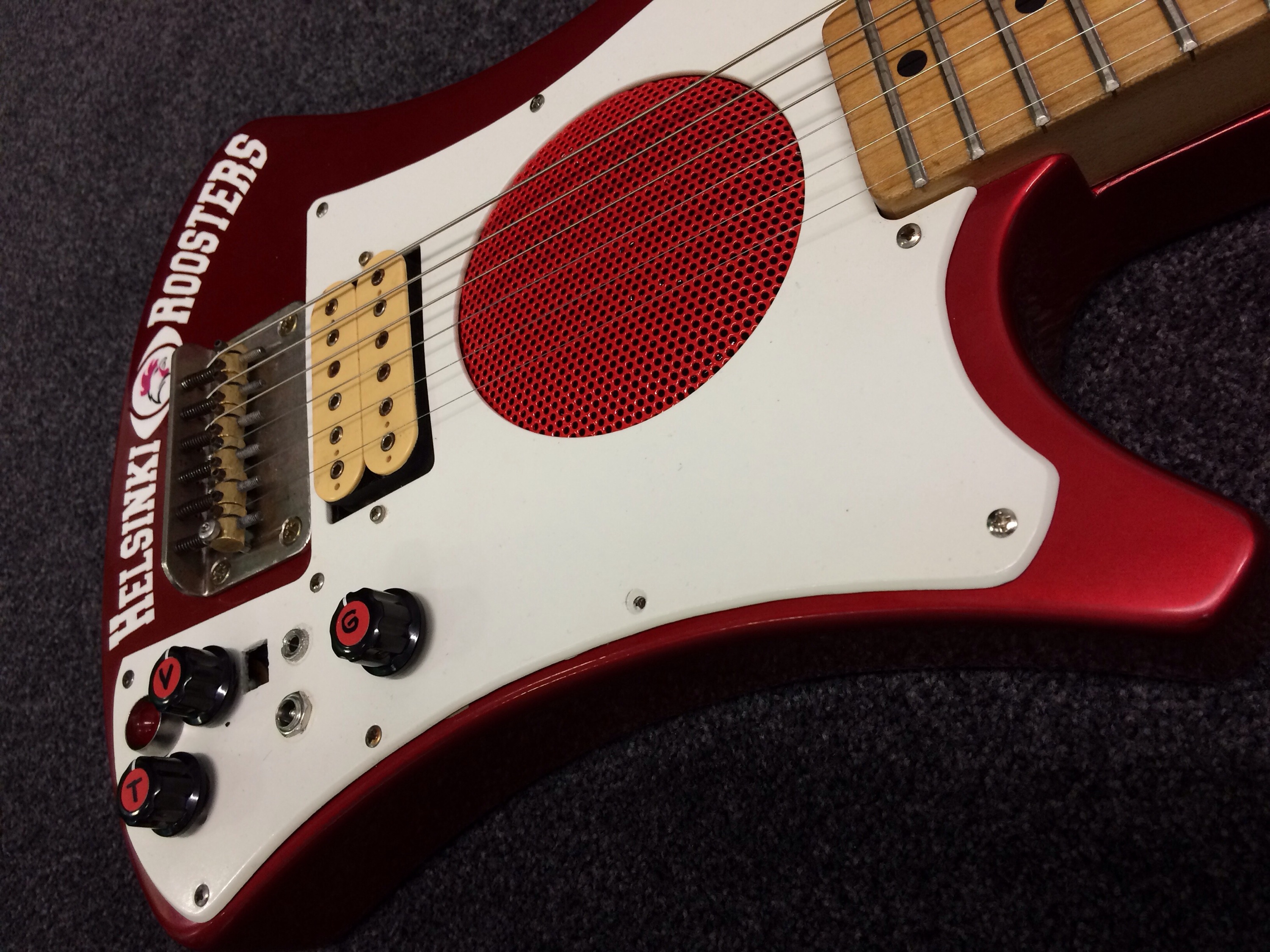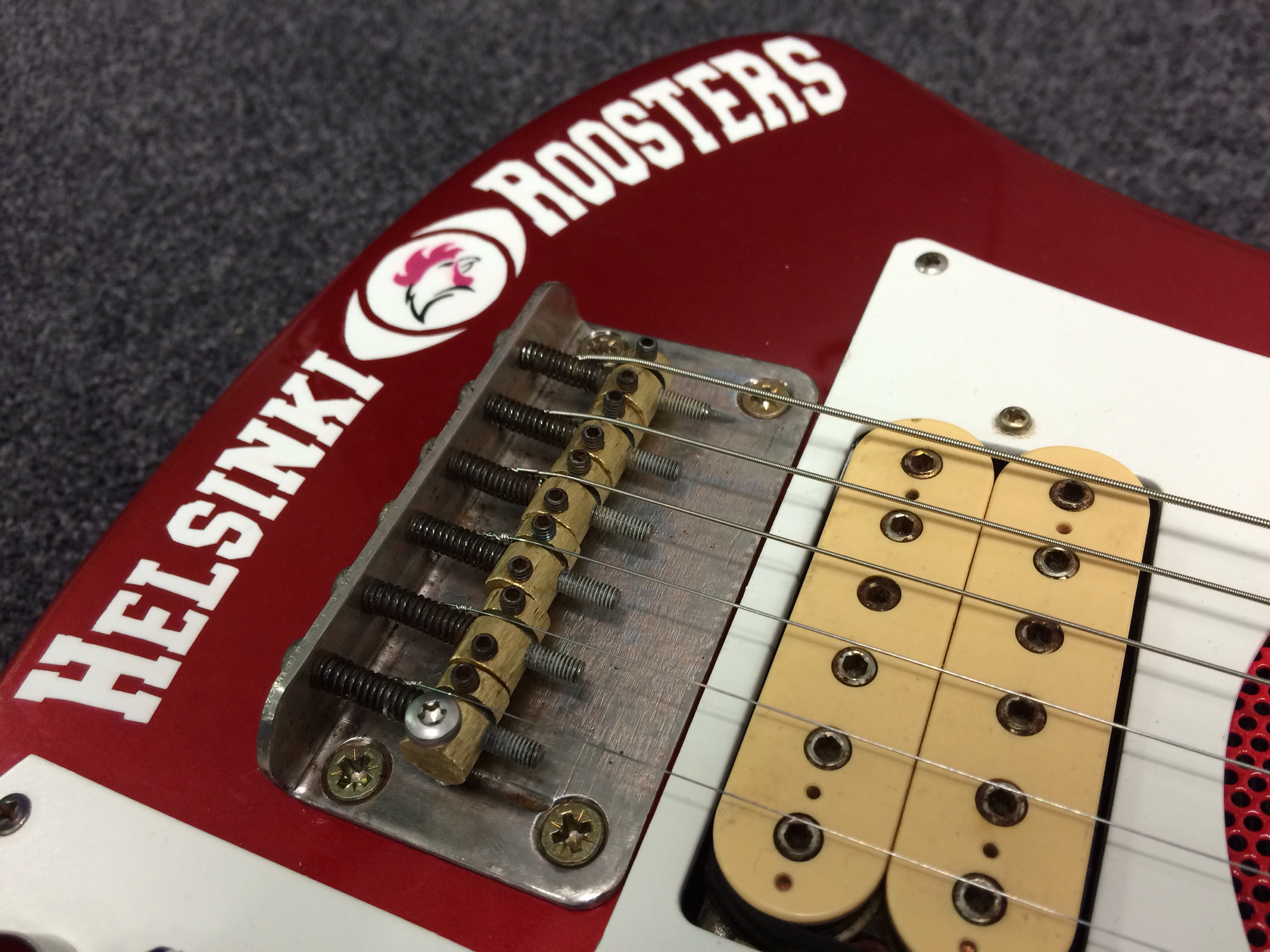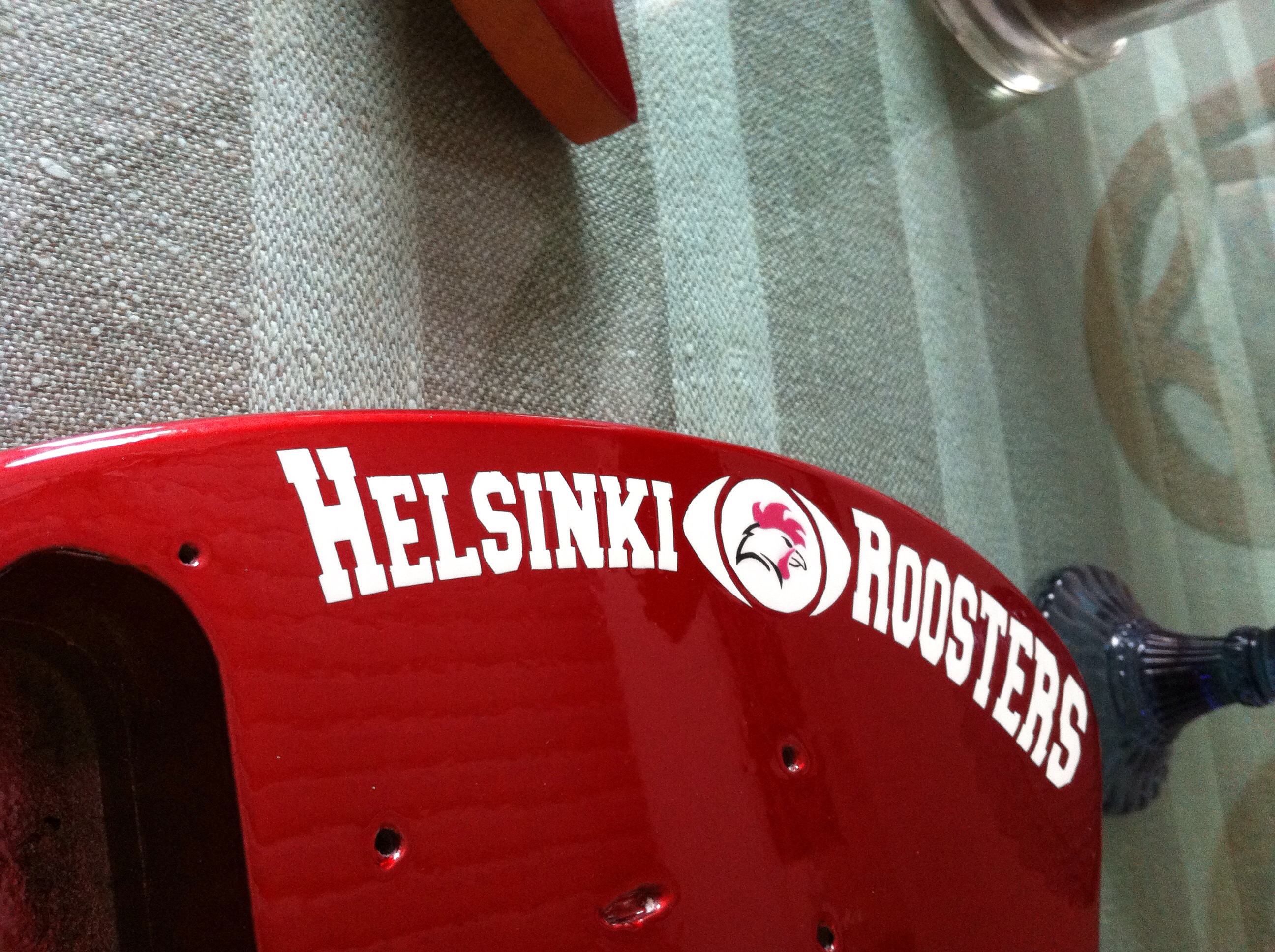 Sain tänään muutaman kuvan ekasta maalamastani kitarasta. Tuli aika villi candy väri. Ja logokin onnistu ihmeen hyvin käsipelissä tehdyllä sabloonalla.